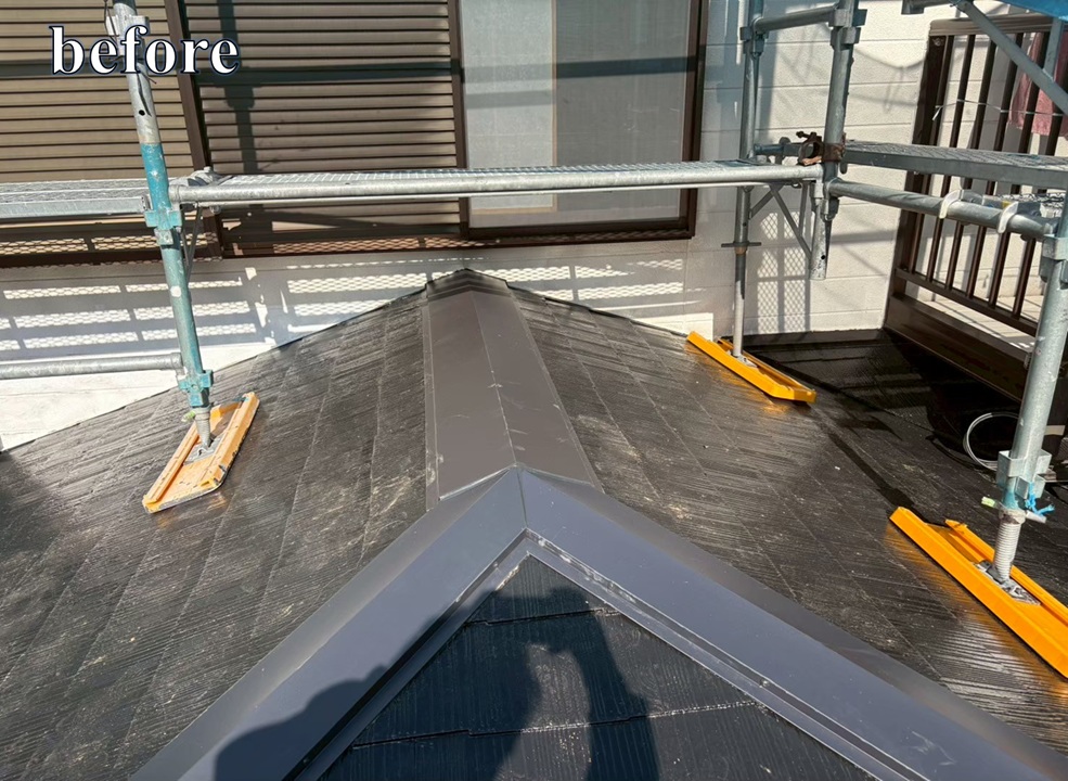 施工前は、棟板金の浮き・釘の緩み、板金の歪みが確認され、