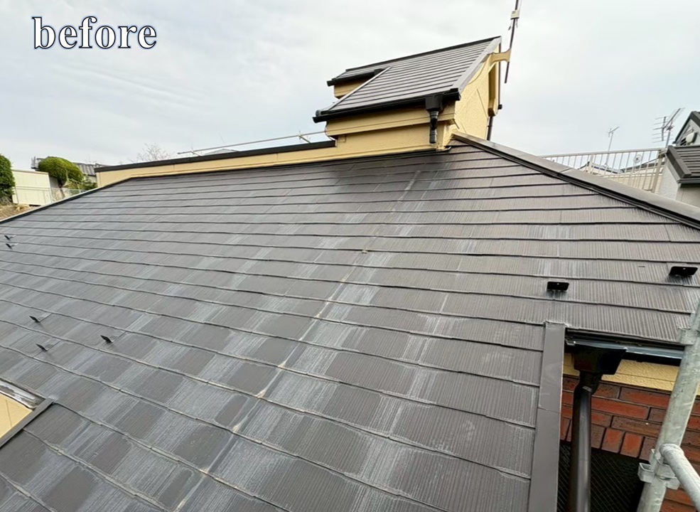 施工前は、上部からの雨水が屋根材の上を直接流れ落ちる状態でした。そのため、写真(Before)のように水が流れる箇所だけ屋根材の劣化や変色が進んでいました。